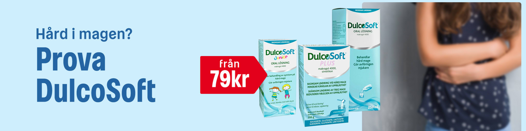 Många lider i det tysta av hård mage och förstoppning, vilket kan påverka humöret och vardagen. Magproblem är tyvärr inget som det pratas högt om, eftersom det kan kännas pinsamt. Ibland behövs det bara lite extra hjälp att få magen att fungera. Förstoppning är frustrerande, men hjälp finns att få! Att ha en livsstil anpassat för att undvika förstoppning är något att sträva efter, men ibland behövs en lösning på kort sikt. I så fall kan det vara lämpligt att prova DulcoSoft. DulcoSoft behandlar symtom på hård mage och gör avföringen mjukare – utan att ge ett plötsligt behov av att gå på toaletten. Effekten på Dulcosoft kommer gradvis efter 24-72 h. Smaken är neutral och kan blandas i valfri dryck som tex juice eller te.