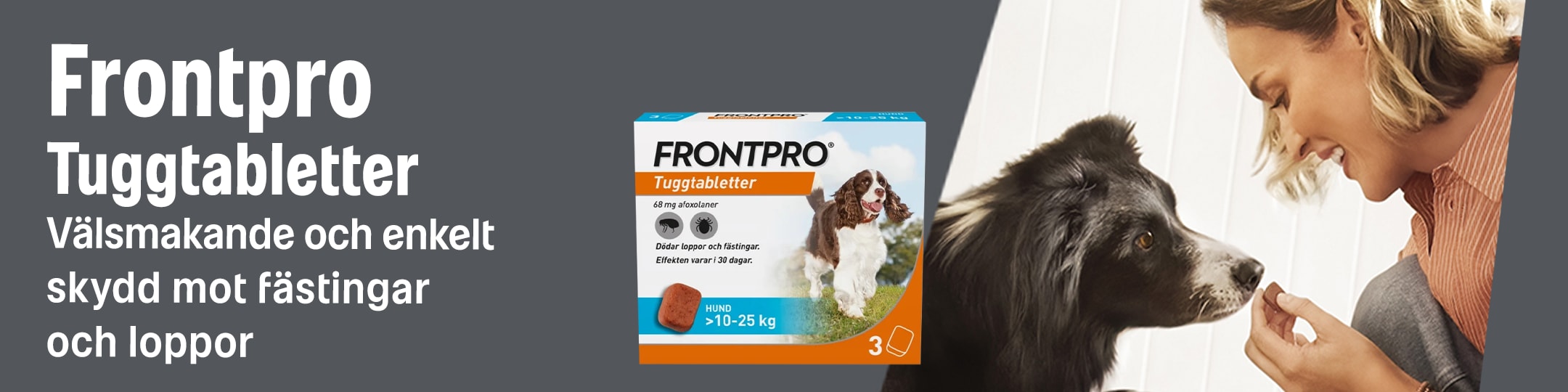 FRONTPRO® är en mjuk välsmakande tuggtablett som är snabb- och långtidsverkande mot loppor och fästingar på din hund. Behandlingen är godkänd för alla hundraser; för hundar som är äldre än 8 veckor och väger över 2 kg. Kan ges antingen som en godbit eller tillsammans med mat. Det är den enda receptfria fästingtabletten som är godkänd till avelstikar, dräktiga och digivande hundar.