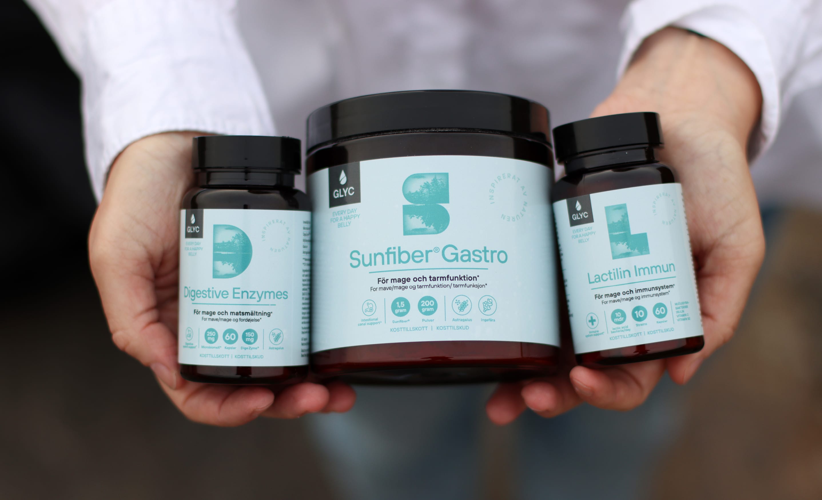 En välfungerande mage är grunden för god hälsa och välbefinnande. GLYC Sunfiber® Gastro är en naturlig fiberprodukt med Sunfiber®, ett kostfiber för tarmen och kalcium som bidrar till normal matsmältning. GLYC Digestive Enzymes innehåller enzymer som hjälper kroppen att bryta ner maten, samtidigt som kalcium ger extra stöd för matsmältningen. GLYC Lactilin Immun innehåller 10 miljarder levande mjölksyrabakterier, inulin och vitamin C för att bidra till ett normalt immunförsvar. Denna serie kan användas individuellt eller i kombination.
