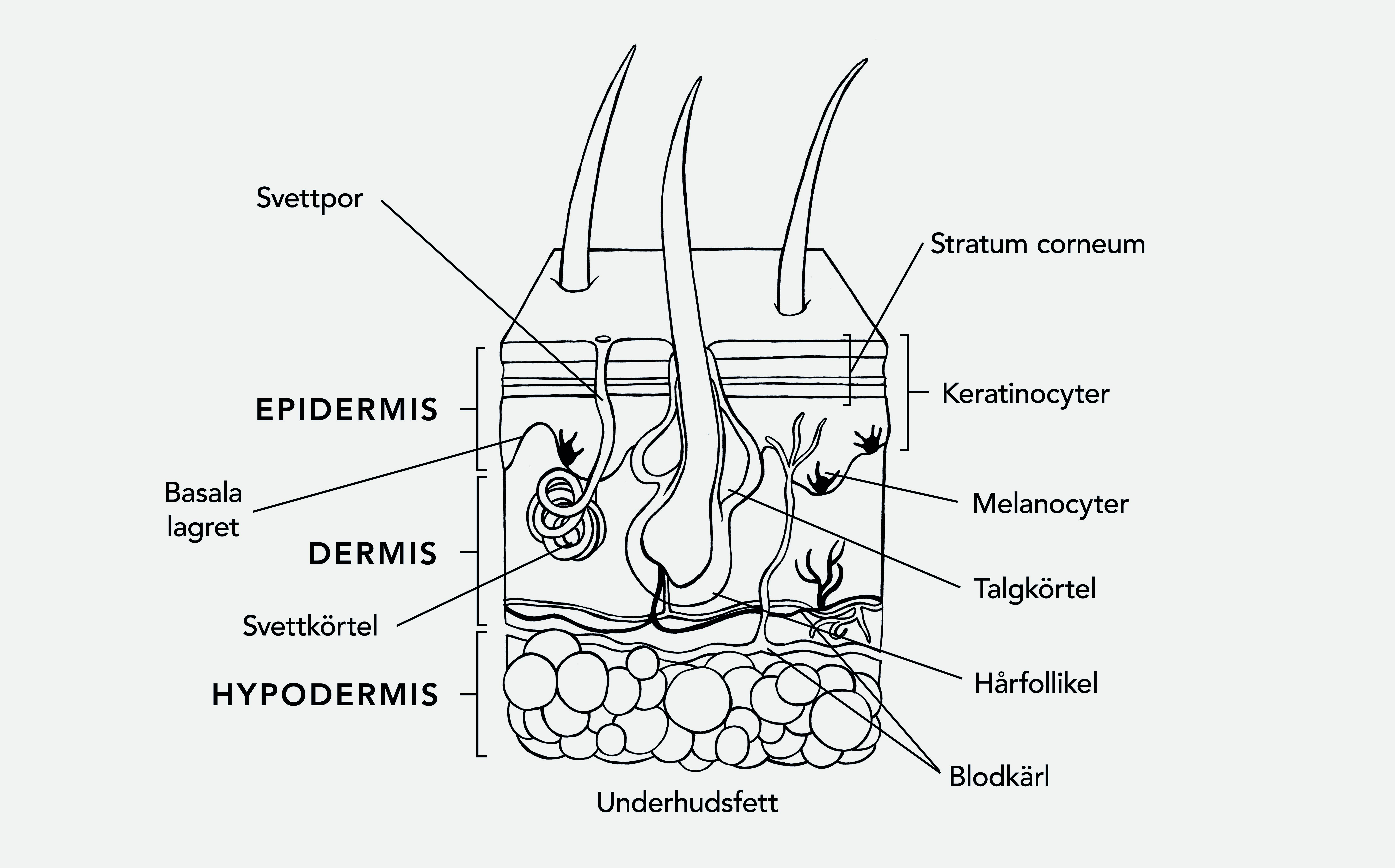 Huden består av tre lager och varje lager består av flera skikt. I våra hudlager finns biljontals celler, bakterier, hårfolliklar, talg- och svettkörtlar och blodkärl. På huden finns dessutom det relativt nyupptäckta mikrobiomet, vår egen goda hudflora som spelar en stor roll för vår hudhälsa. Mikrobiomet (hudfloran) kommer vi att berätta mer om med hjälp av Johanna i kommande avsnitt, men nu i vårt första avsnitt med information om huden börjar vi från början genom att förklara hur huden är uppbyggd: