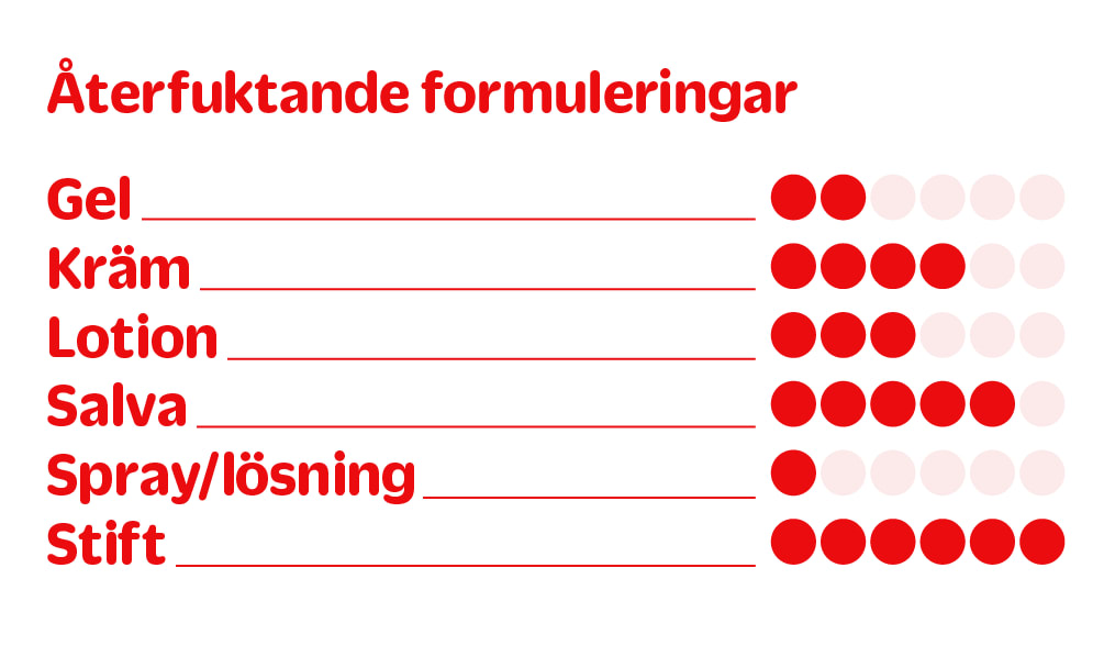 En fetare produkt ger en bättre återfuktande effekt men kan upplevas som kladdig eller svår att stryka ut. Vilket man bör välja beror på hur torr man är och kanske även var på kroppen man är torr. Till läppar kan ett stift passa bäst medan en torr hårbotten enklast behandlas med en lösning.