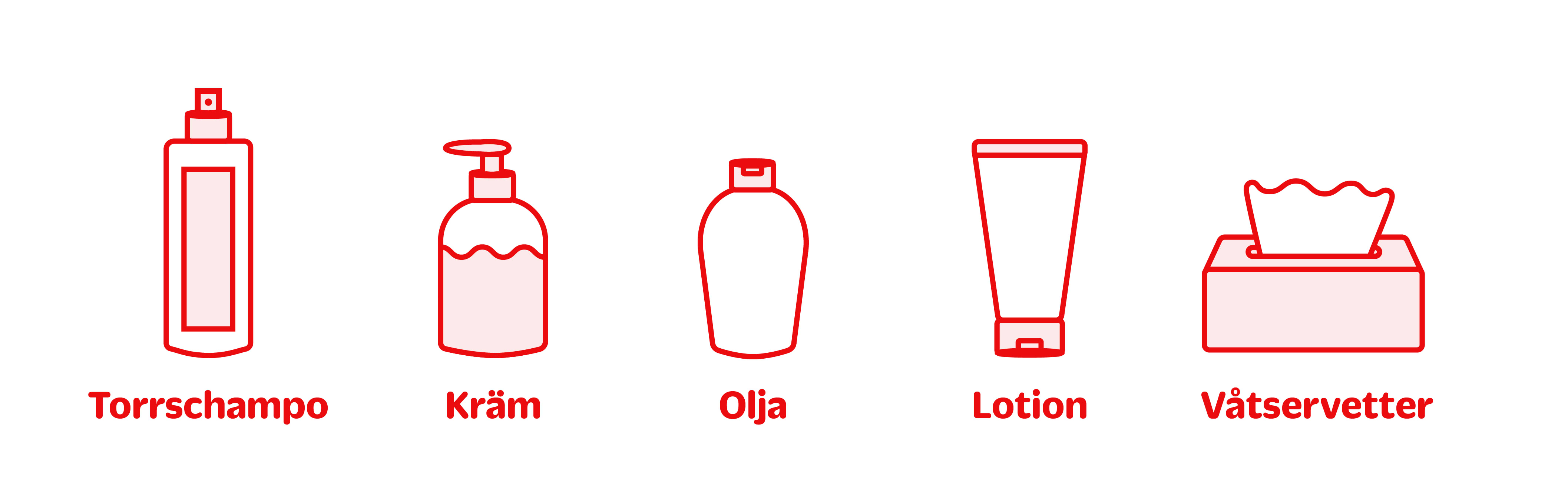 Det finns många bra torrschampon som fräschar upp håret utan att man behöver duscha kroppen. Milda tvättservetter och återfuktande handdesinfektion kan också vara bra att ha hemma.
